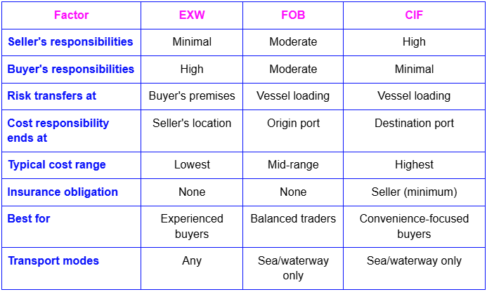 The three core Incoterms represent fundamentally different approaches to international trade. Let's compare them side-by-side.